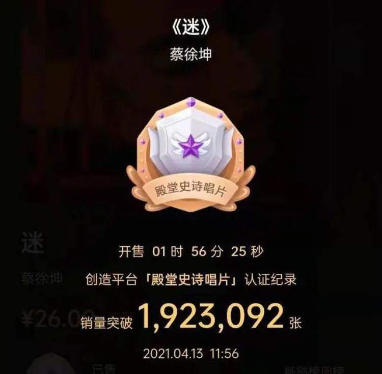 8月29日,《极目新闻》报道称,蔡徐坤专辑《迷》在QQ音乐上售卖4个多月,共卖出323.8万张,销售总额约为8419万元。