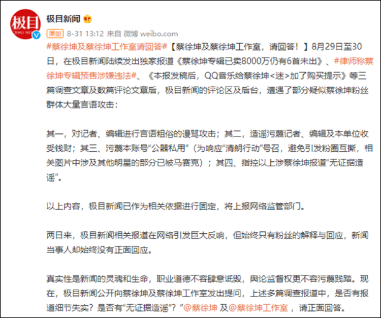8月31日下午,《极目新闻》公开向蔡徐坤及蔡徐坤工作室喊话,多篇调查报道中,是否有报道细节失实?是否有“无证据造谣”?”要求蔡徐坤及蔡徐坤工作室正面回答。