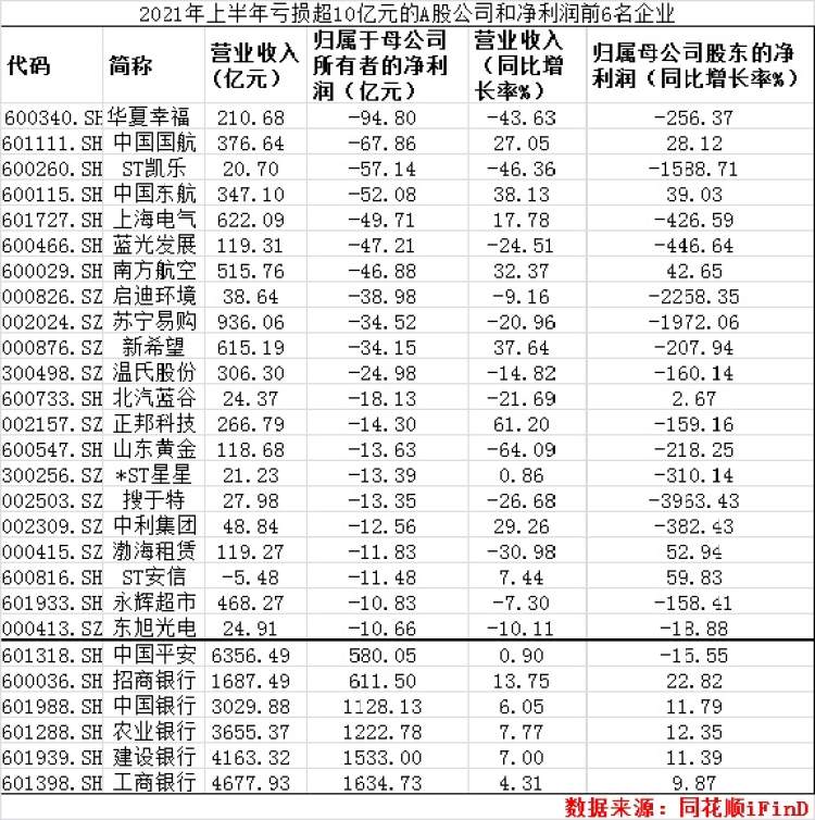 在总体营业收入和净利润均实现两位数增长情况下,也有部分企业经营存隐忧。上半年沪深两市亏损公司561家,其中亏损10亿元以上公司21家;航空机场等是亏损大户。