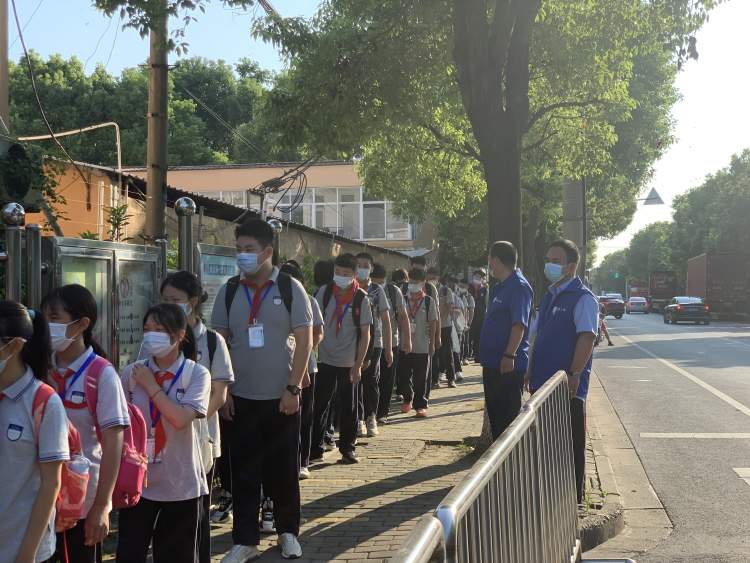 志愿者兵分三路,一组指挥公交车辆规范停靠站,礼让行人有序通行;一组分流行人和送学家长,护送学生过斑马线,协助维持交通秩序;最后一组帮助老师引导学生安全进入校园,并提示学生规范佩戴口罩,做好个人防护措施。