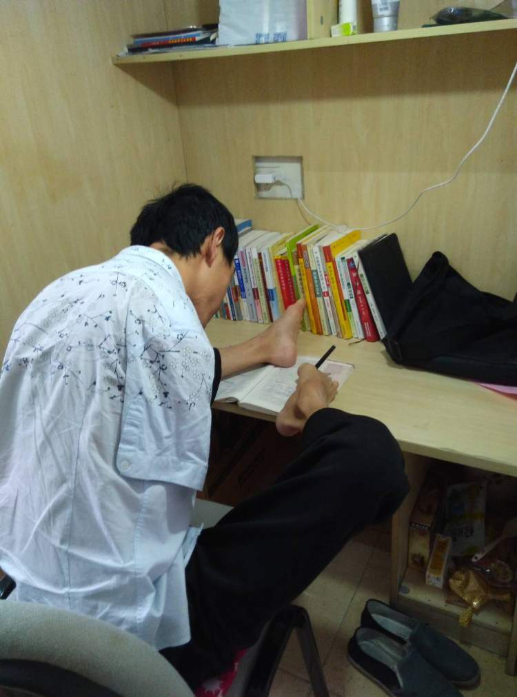 这是同济大学专门为他准备的“考桌”。复试当天上午,彭超签到后,学校研究生招生办公室的老师找来了两只木凳和一张木板拼成一张特殊的课桌,以便他用脚答题。