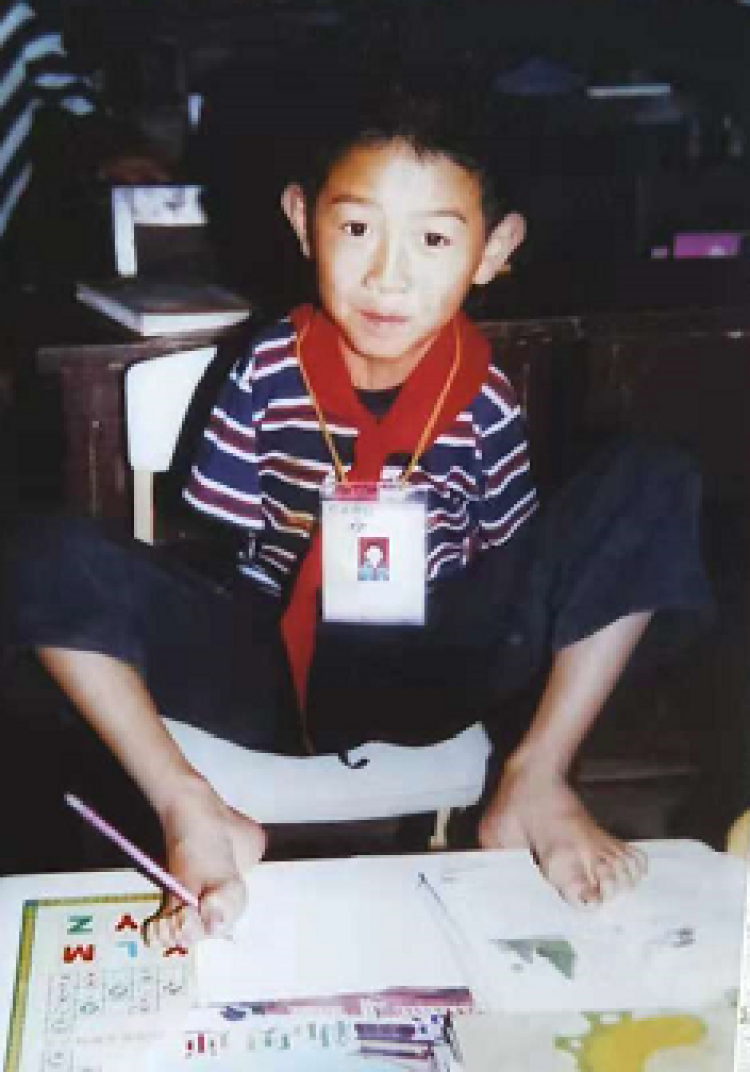 在很长一段时间,小彭超只穿拖鞋,以便随时以脚代手。夏天凉拖鞋尚好,冬天尽管穿着棉拖鞋,但脚跟却常常冻裂,加上写字需要脚跟作为支撑点,一层厚厚的老茧结在他的右脚。