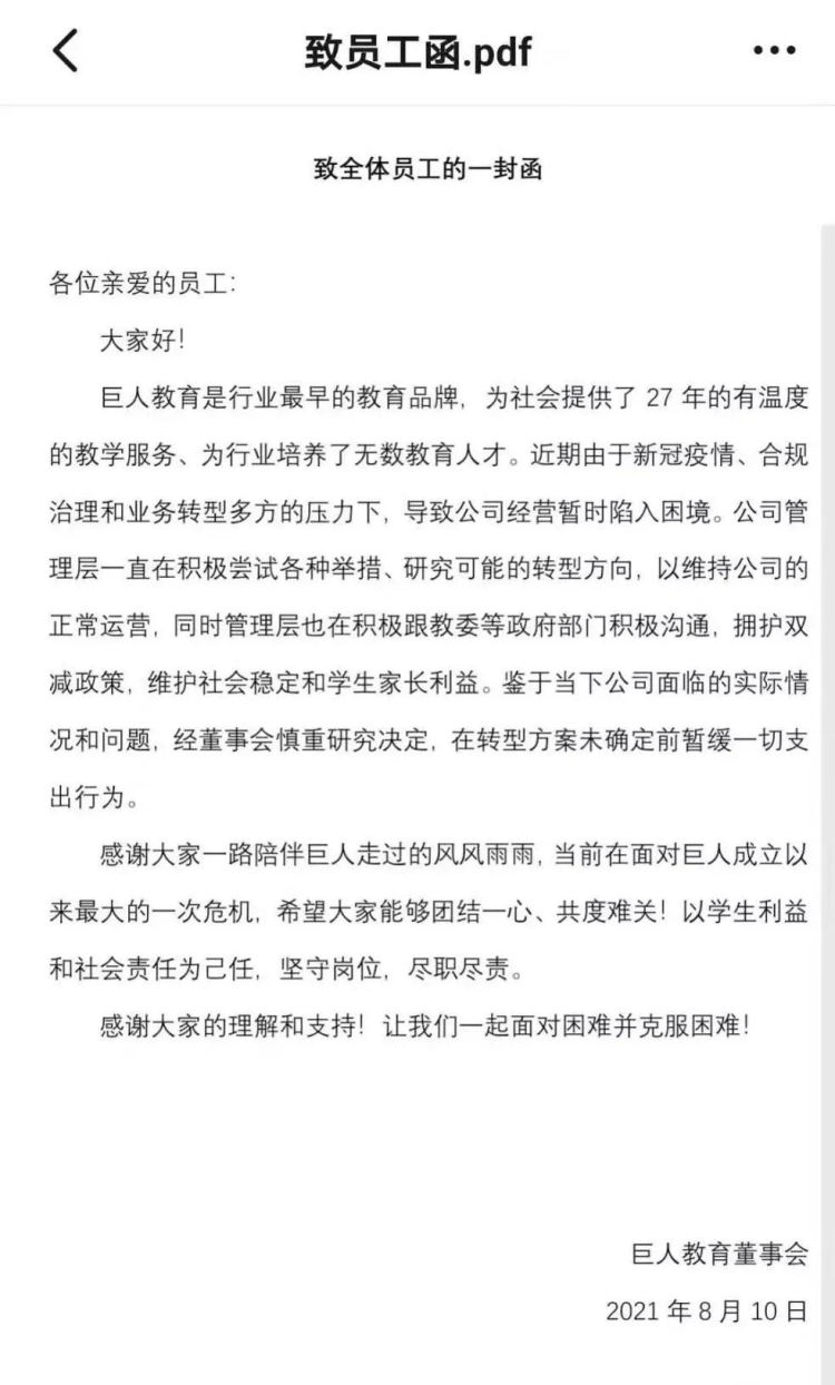 而仅仅20天前,巨人教育在《致全体员工的一封函》中,还表示暂停一切支出,正在努力度过危机。