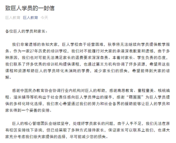 8月31日,成立27年、曾被誉为“教培黄埔军校”的巨人教育宣布倒闭。在《致巨人学员的一封信》中公司表示,由于经营困难将无法继续向学员提供教学服务,也可能无法满足家长的退费要求,将尝试协调资源供学员转化课程。
