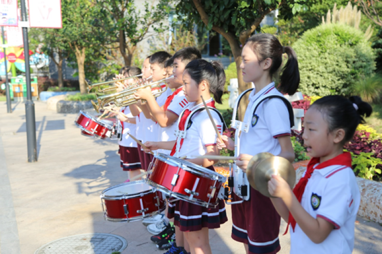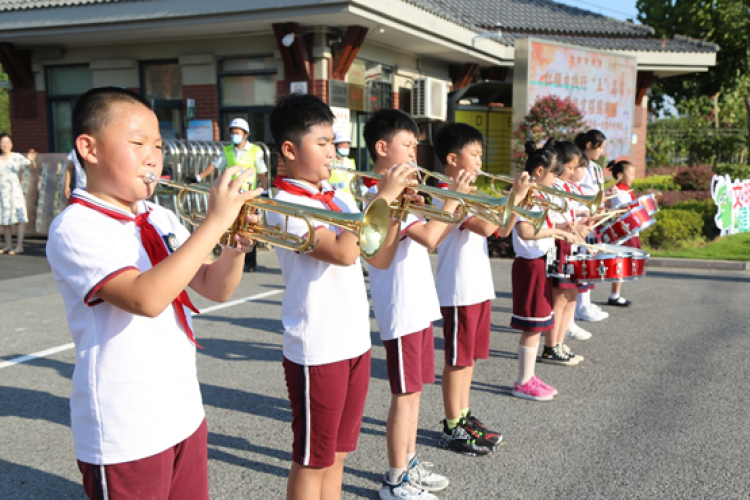 对于九亭五小的学生来说,开学这一天的行程满满当当,内容趣味盎然。一大早,家长志愿者、值日老师、大队部志愿者早已站在校门口,为同学们有序、安全入校保驾护航,乐团的学生们更是拿起了自己心爱的乐器,排成一排,进行欢迎音乐表演。