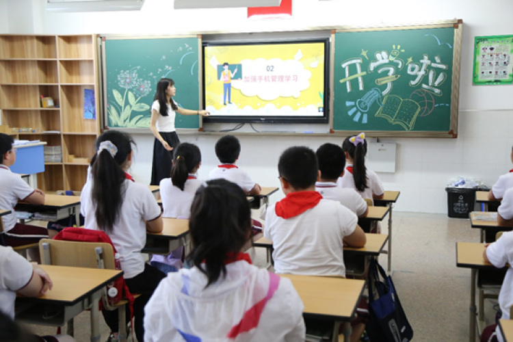 今天,松江九亭五小的开学典礼有些特殊——学生们没有聚集在一起,去现场参加开学典礼活动,而是整齐地坐在教室里,有序观看提前录制好的开学典礼视频。