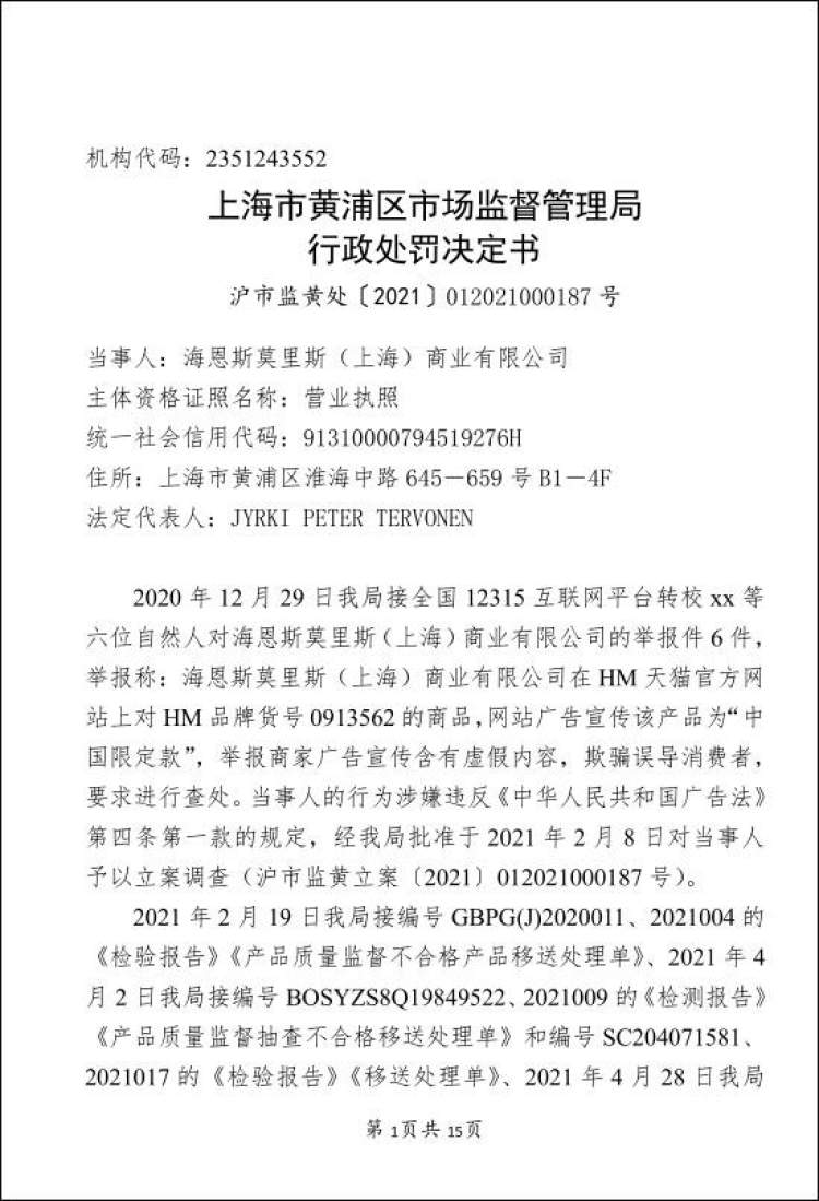 因在产品广告宣传上使用“中国限定款”的表述,被市场监管部门认定为虚假宣传。近日,H&M子公司海恩斯莫里斯(上海)商业有限公司被黄浦区市场监管监管局作出行政处罚,并处以罚款26万余元。