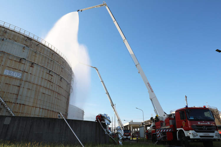 容积2万立方米的燃料油储罐进料口泄漏后发生火灾,该如何扑救?8月31日下午,化工区消防救援支队在园区百联油库r302罐开展油罐火灾事故处置实战演练。