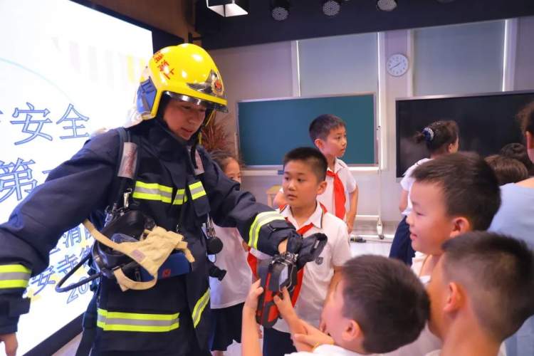 在市西小学,现场体验环节更是引得学生们兴趣高涨,踊跃提问,不少学生轮番上台,戴上了消防员的头盔、手套。