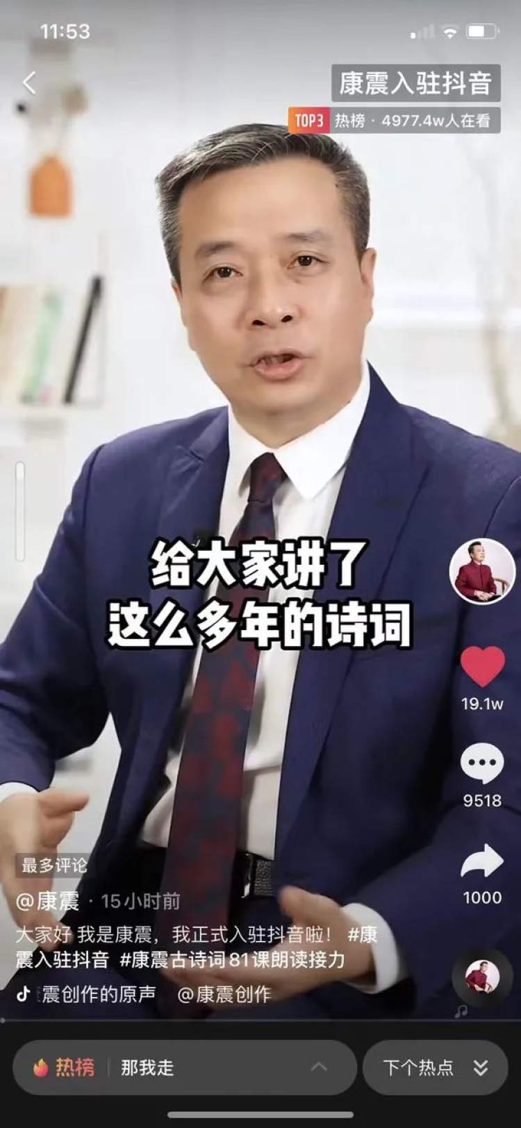 出于自己最熟悉的诗词领域的热爱,康震甚至也在思考,“如果古代有抖音,李白、杜甫、孟浩然等都会争先恐后开账号,他们要通过抖音让自己的诗词、主张被更多人知道。”
