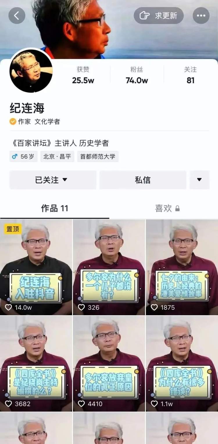 最近,曾经在中央电视台《百家讲坛》上为众多年轻人带去历史启蒙的纪连海,开通了他个人的抖音账号,并且只用了短短十天时间就收获了70多万粉丝。