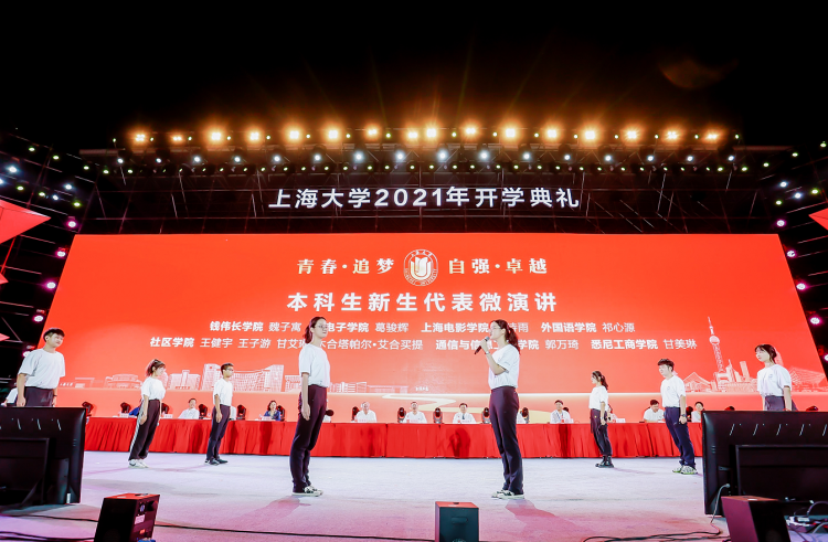 9月3日傍晚,上海大学体育场,来自97个国家和地区的1.1万余名2021级本科生、研究生和国际留学生新生,身着主题分别为“青春”“追梦”“自强”“卓越”四种颜色新生服,组成“1921”“2021”两个数字,跨越百年薪火相传,共同见证了一场庄重恢宏的开学典礼。