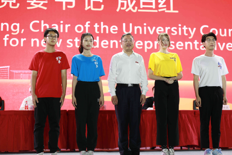 校党委书记成旦红教授为四位本、硕、博和留学生新生代表佩戴校徽。这是仪式,更是传承。对新生而言,接过这枚校徽,就意味着秉承“自强不息;先天下之忧而忧,后天下之乐而乐”的校训精神,更意味着接过时代重任,以青年爱国之心,行壮志报国之举。