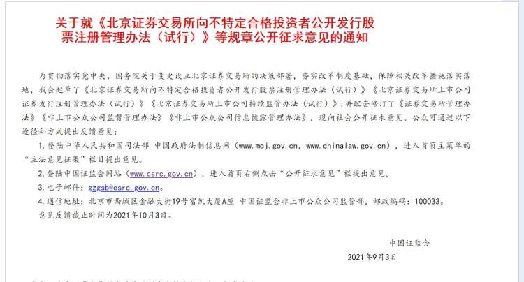 北京证券交易所服务创新型中小企业,总体平移精选层上市、交易、转板、退市等基础制度,坚持合适的投资者适当性管理要求,形成一套契合中小企业特点的差异化制度安排,探索资本市场支持服务中小企业科技创新的普惠金融之路。9月3日起证监会就北京证券交易所有关基础制度安排向社会公开征求意见至10月3日、