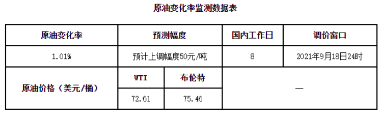 根据卓创资讯的数据,截至本周期第八个工作日,原油变化率为1.01%,预计上调幅度50元/吨,刚刚踏上油价调整的“及格线”。成品油零售价年内第18次调整将在9月18日晚上打开,也就是在 “中秋节”假期前开启,各位车主不妨在节前“加满油”。