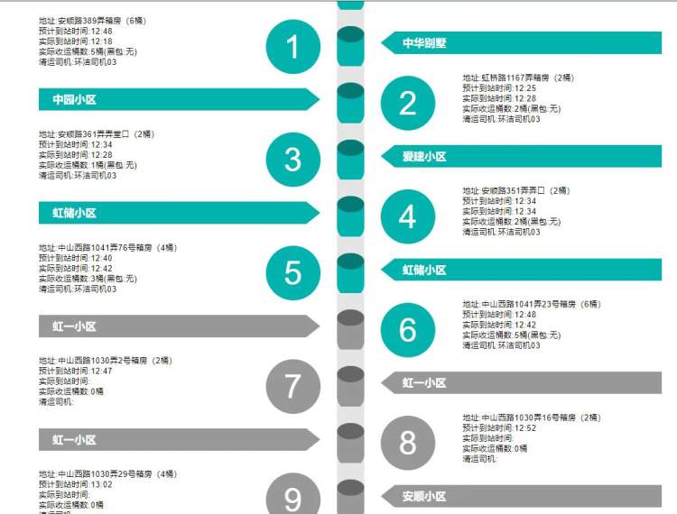 在智管平台上,记者看到,有干垃圾、湿垃圾、餐厨垃圾清运的点位像公交站点一样被排列,清运车到达每个点位的实际时间、收运的垃圾数量等都清晰标注。每个点位还有绿色、红色、灰色、蓝色等不同颜色之分,红色点位表示因特殊情况,该点位垃圾暂未被清运;绿色点位表示正常清运;灰色点位表示等待清运;蓝色点位表示今天已去清运,但实际未收到垃圾。