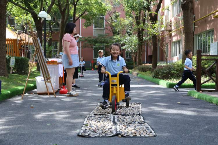 比如,周到君在嘉定区红石路幼儿园看到,小朋友们在智动园进行户外体育锻炼、在菜趣园里观察种子的发芽,在沙滩上玩排球、在水生园摆出瓶瓶罐罐观察水的浮力,还能在步道上兴高采烈地进行滑步车运动……