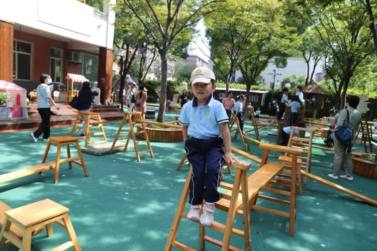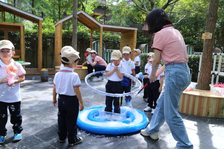 而在嘉定区实验幼儿园,有些小朋友在进行神奇百变魔方游戏,有些则玩起了户外表演,还有些在老师的带领下,玩起了五彩泡泡,各种各样的户外体育运动、民间传统游戏等等,都让孩子们兴致勃勃。