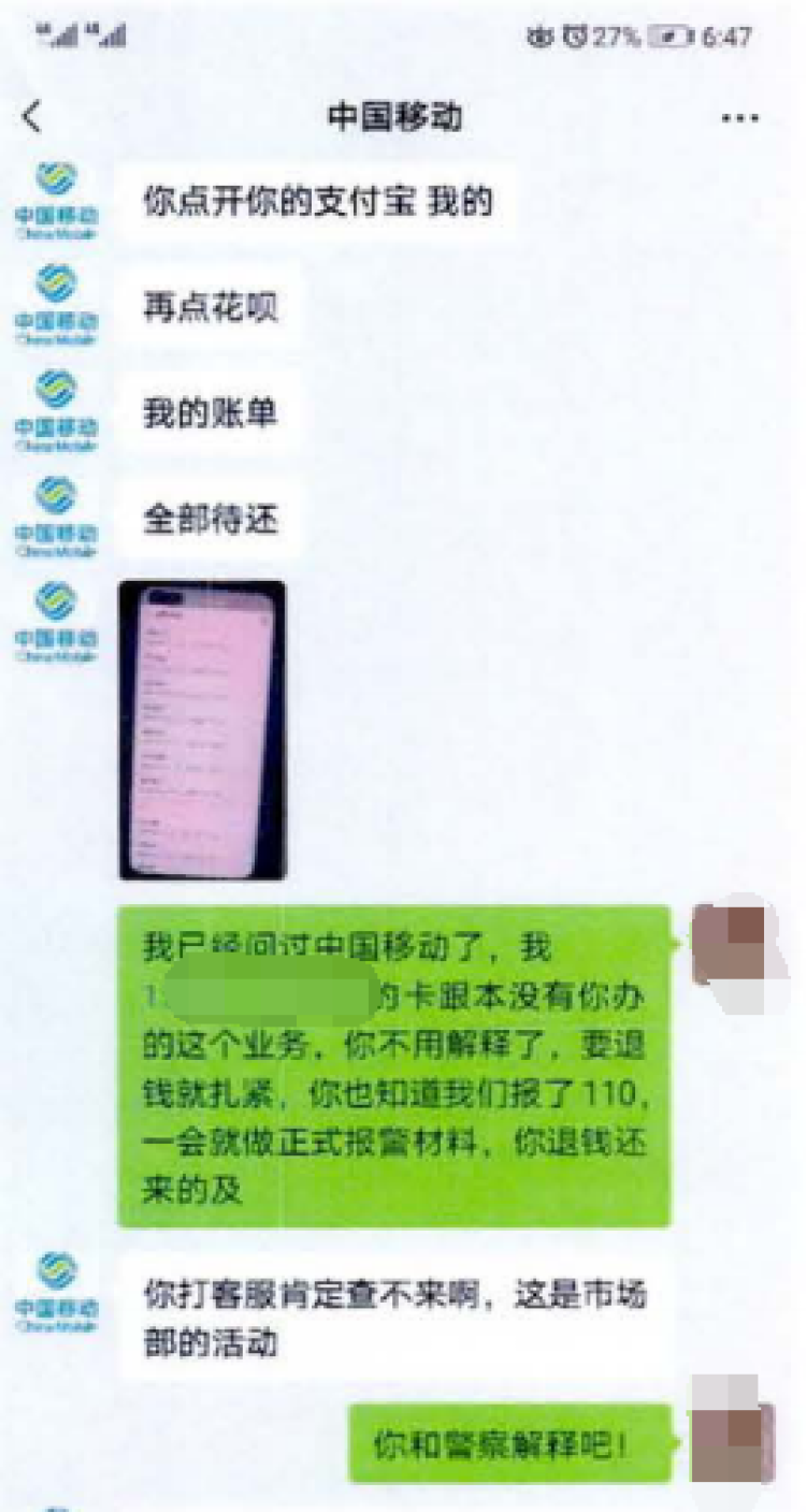 众多移动客户看见他们的假工作证便不疑有他,想着自己将会长期使用电话卡,充值24个月还能获得空气净化器,何乐而不为?于是纷纷爽快充值,该犯罪团伙成功率极高。在客户答应充值后,这些业务员就会帮客户在支付宝开通一个真实的每月花呗自动冲,再扫描客户付款码收取一份套餐总价,每名客户等于付了两遍钱购买了一个的套餐。