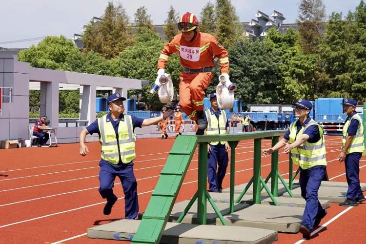 其中,灭火战斗员竞赛项目设置100米消防障碍、攀登挂钩梯、攻坚技巧、极限穿越4个模块;