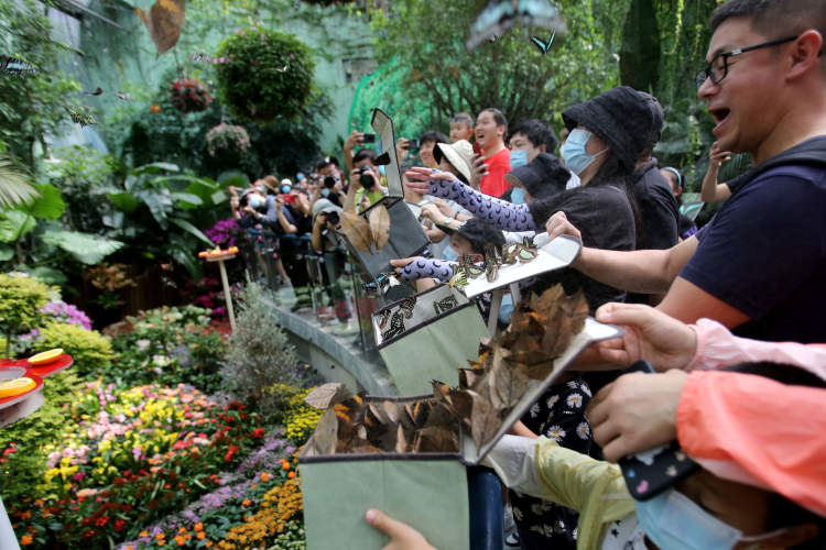 本届蝴蝶展持续至10月底,将有约30种近7万只色彩斑斓的活体蝴蝶被陆续放飞于蝴蝶花园里。