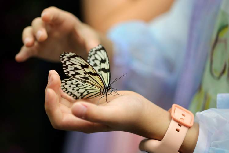 每年的蝴蝶展,蝴蝶放飞仪式是令小朋友最为期待的环节。今天,受邀的小朋友在动物园饲养员指导下,小心翼翼地将美丽的彩蝶放飞空中。刹那间,千蝶纷飞,满目绚烂,蝴蝶花园内的观众不禁发出赞叹和欢呼声,感叹种类繁多、色彩斑斓的蝴蝶为世界带来的神奇和美丽。
