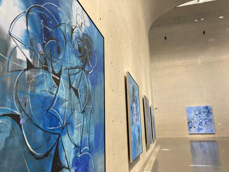 此次在龙美术馆展览,开篇第一个环节,康多就展出了10幅新创作的蓝调绘画系列,他灵活运用蓝调与自由爵士等音乐元素来谱写一曲视觉挽歌,对应着疫情时代的无奈与悲叹。