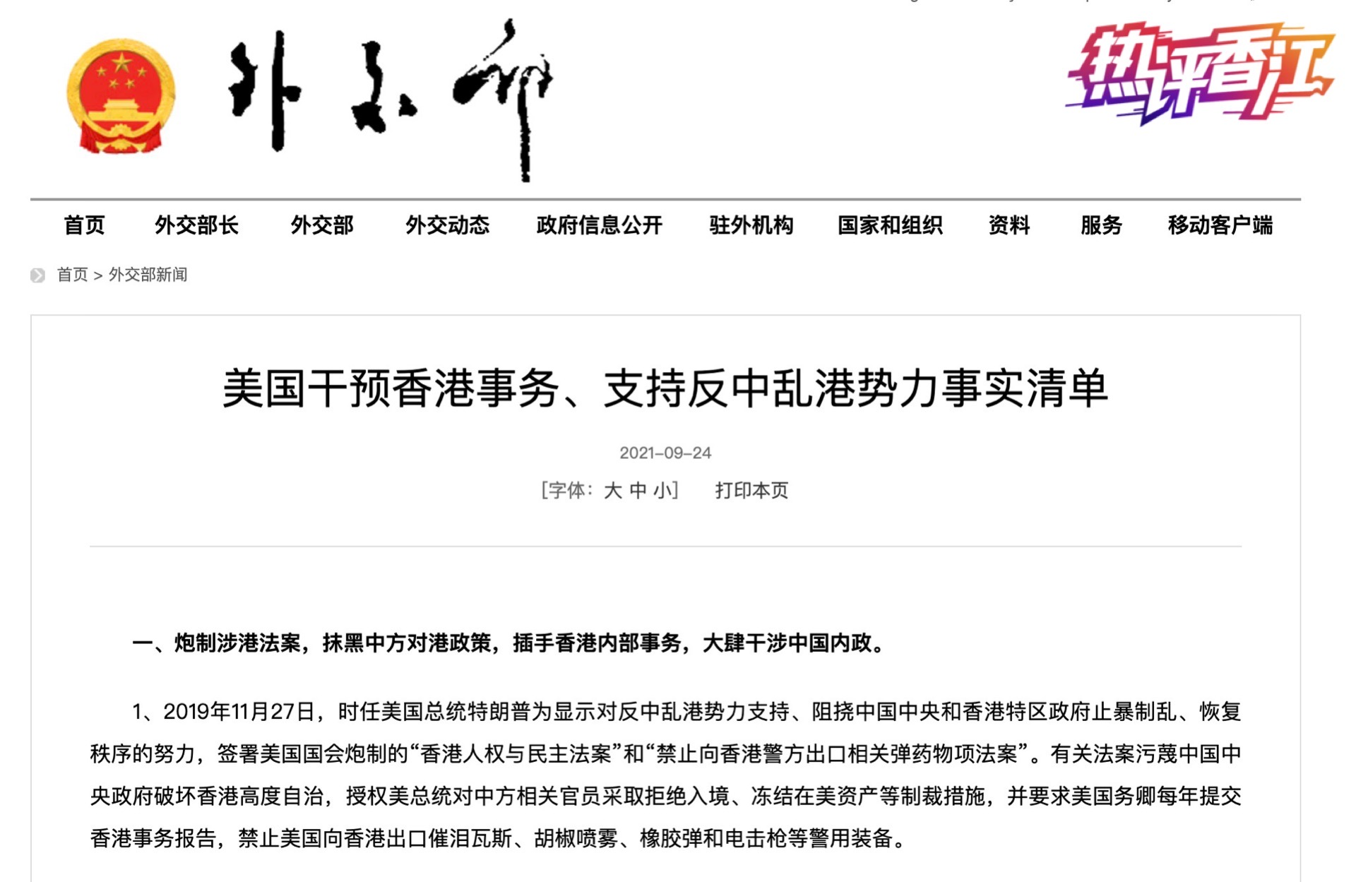 事实胜于雄辩!9月24日,中国外交部发布《美国干预香港事务、支持反中乱港势力事实清单》,详尽列举了2019年“修例风波”以来美国支持反中乱港势力、制造香港社会动荡的累累恶行,共计102项。这一桩桩、一件件的霸权主义恶行,清晰地揭示了美国干预香港事务、遏制中国发展的疯狂图谋。