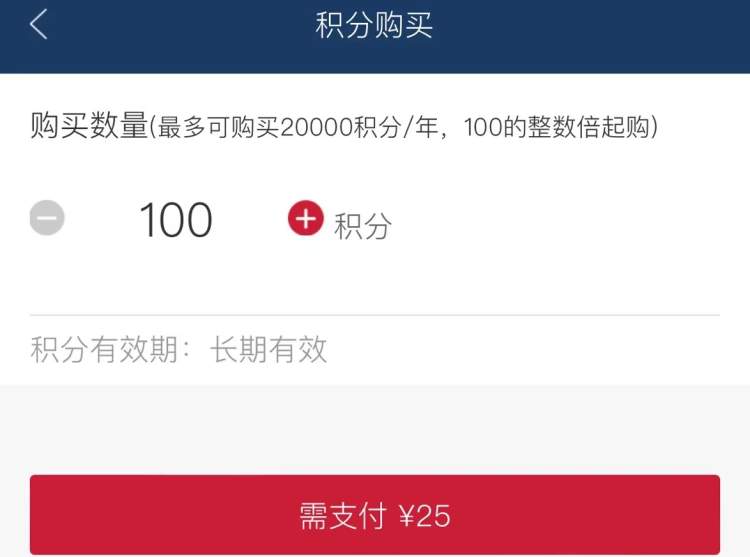 若积分不足,旅客可通过会员服务中的积分购买入口进行购买,以100的整数倍积分起购,每100点需要支付25元,最多每年可购买2万点。