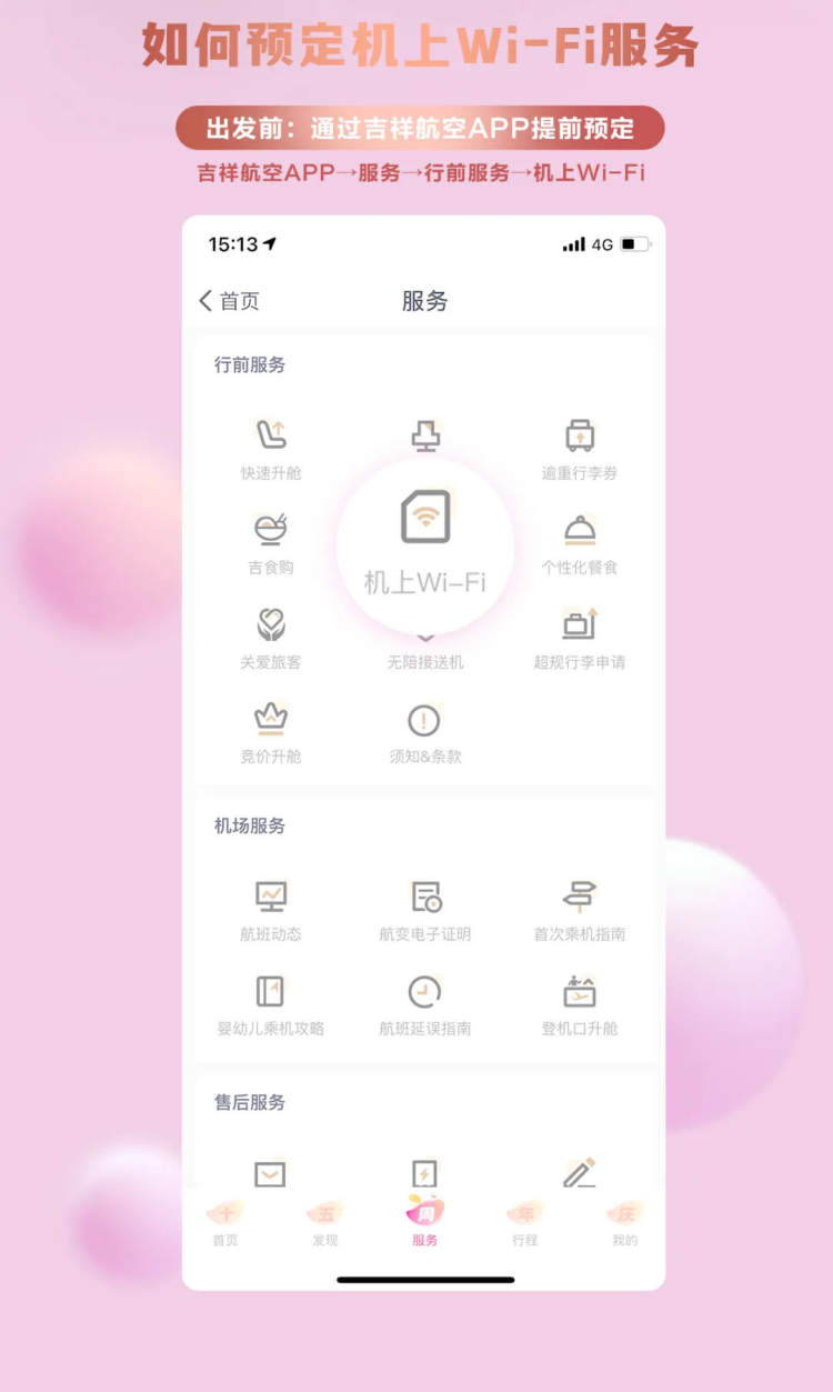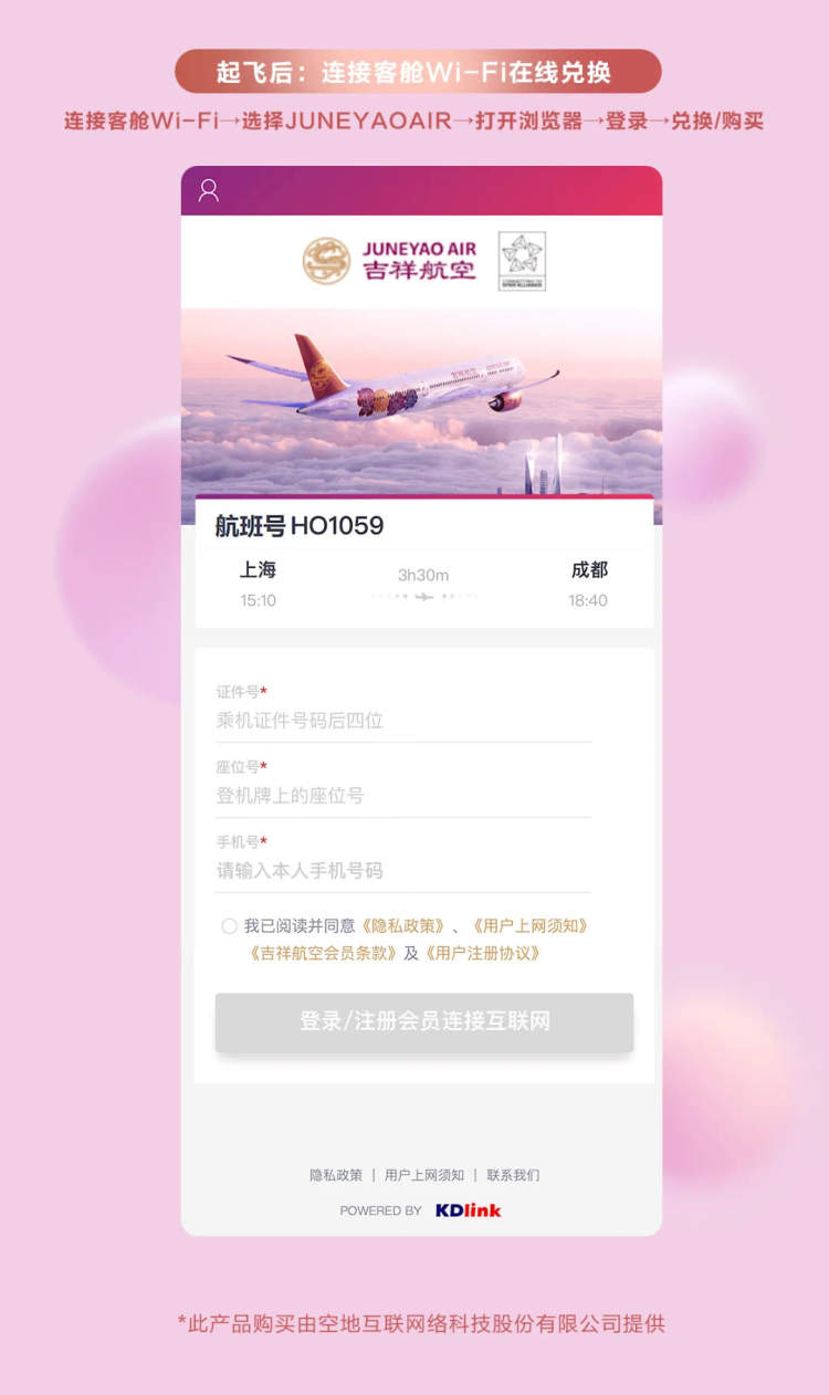 旅客可通过吉祥航空APP预定机上WI-FI服务,在航班起飞前或飞行过程中连接客舱WI-FI进行在线预定,需要50个积分进行兑换或支付50元购买。