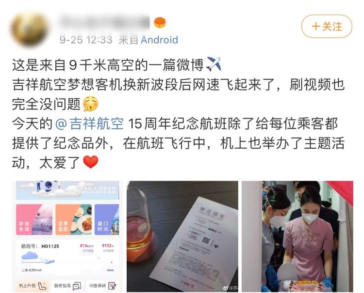 今天的吉祥航空15周年纪念航班上,就已经有网友在高空用机上WI-FI在社交媒体上分享飞行体验了:“网速飞起来了,刷视频也没问题。”