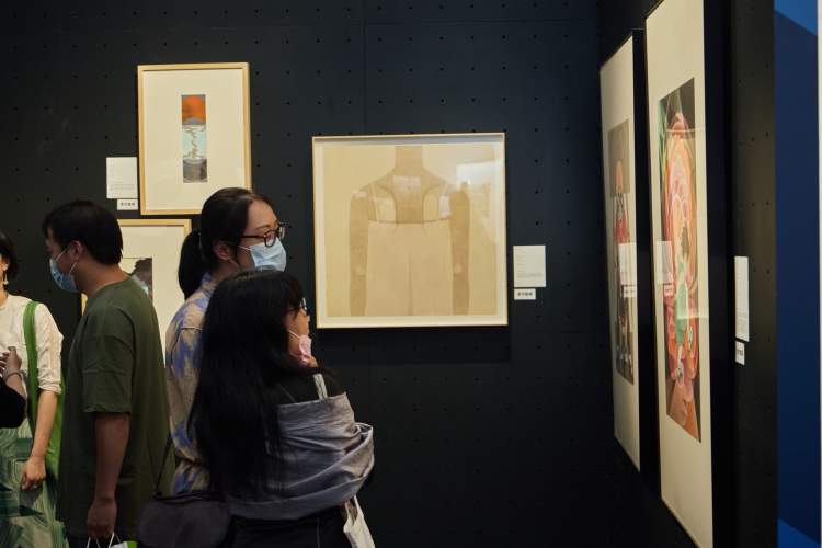 画家陈尚隆在展览上带来了画作《呼吸的诗意》,“我的作品灵感来自一本诗集《夜空总有最大密度的蓝色》,作者的文字虽然冷峻锋利,好像雕琢出冰凉刺骨的绝境,但核心燃烧着炽热火焰,充满能量,告诉读者要寻求爱的勇气与生命的希望。”
