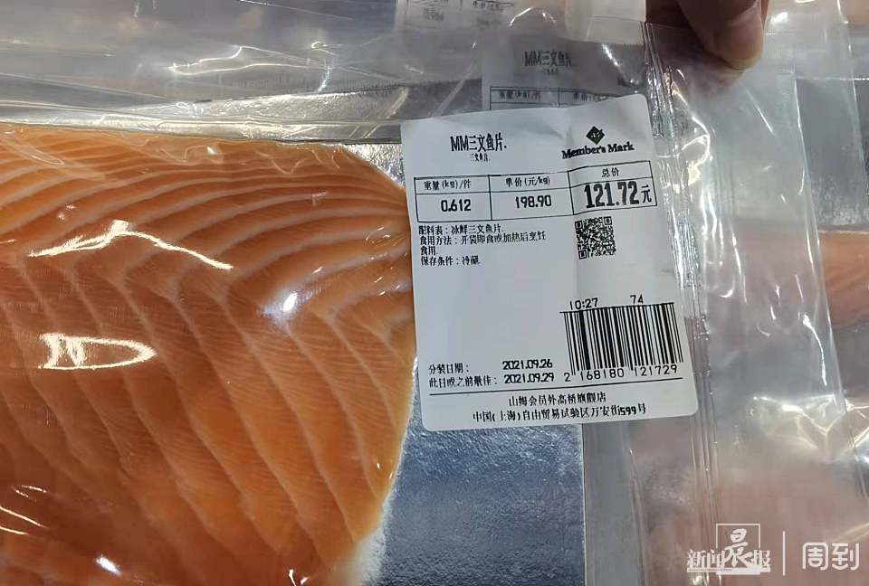 “我到现在为止买过三家会员店的三文鱼,当初盒马X会员店开业的时候,我算过三文鱼比COSTCO的便宜点,后来盒马X会员店的三文鱼涨价了,一斤129元。这边的话一斤是99.45元。”