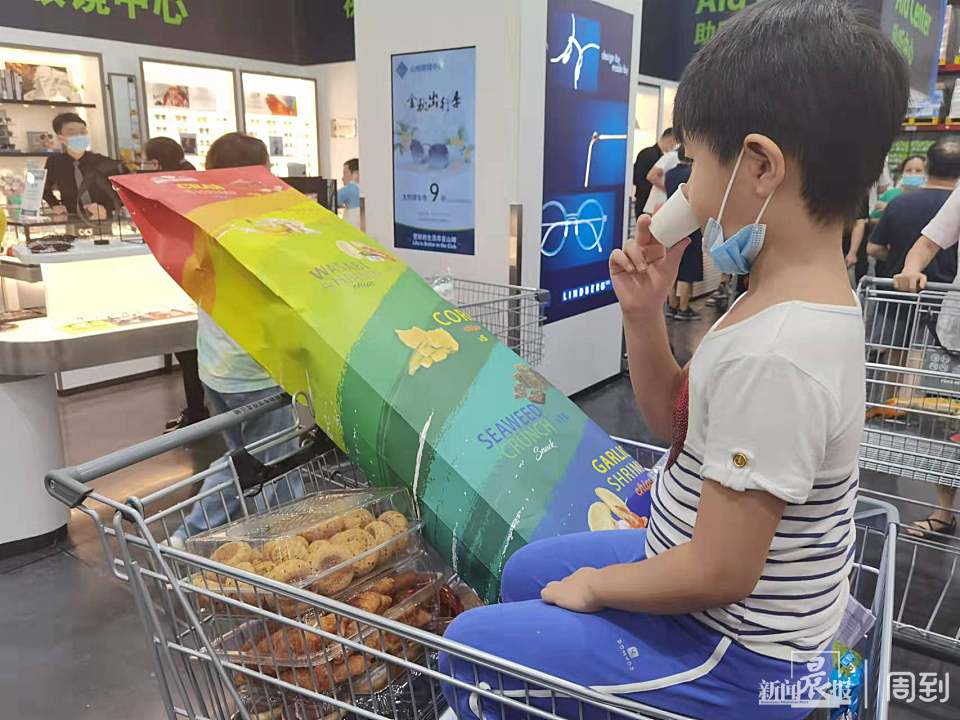 不限量的1.5米高的薯片礼盒也是今天最抢眼的商品之一,标志性的彩虹色长条“巨型身材”使它们异常醒目,在顾客们的购物车中如一道道移动的彩旗,随处可见。