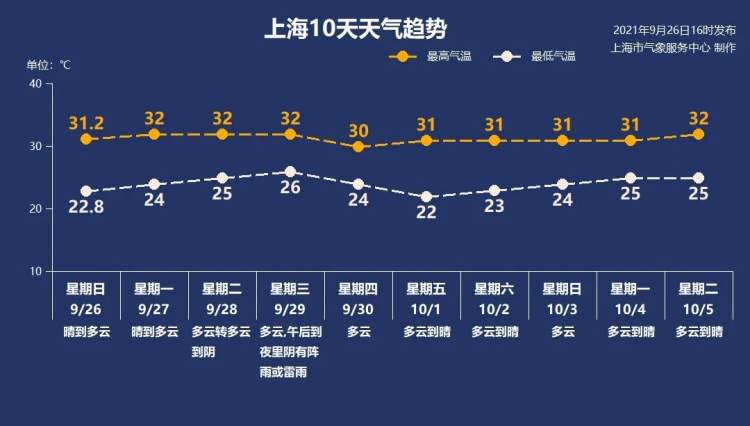 从目前的天气趋势来看,未来一段时间上海的最高气温相当稳定,在30-32℃之间。除下周三午后到夜里有些雨外,其他时间均十分干燥。国庆长假前五天也是连晴无雨。
