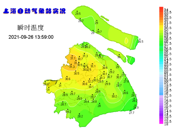 在东南风的吹拂下,今天午后本市气温西高东低,“2”字头和“3”字头的站点各占半壁江山。