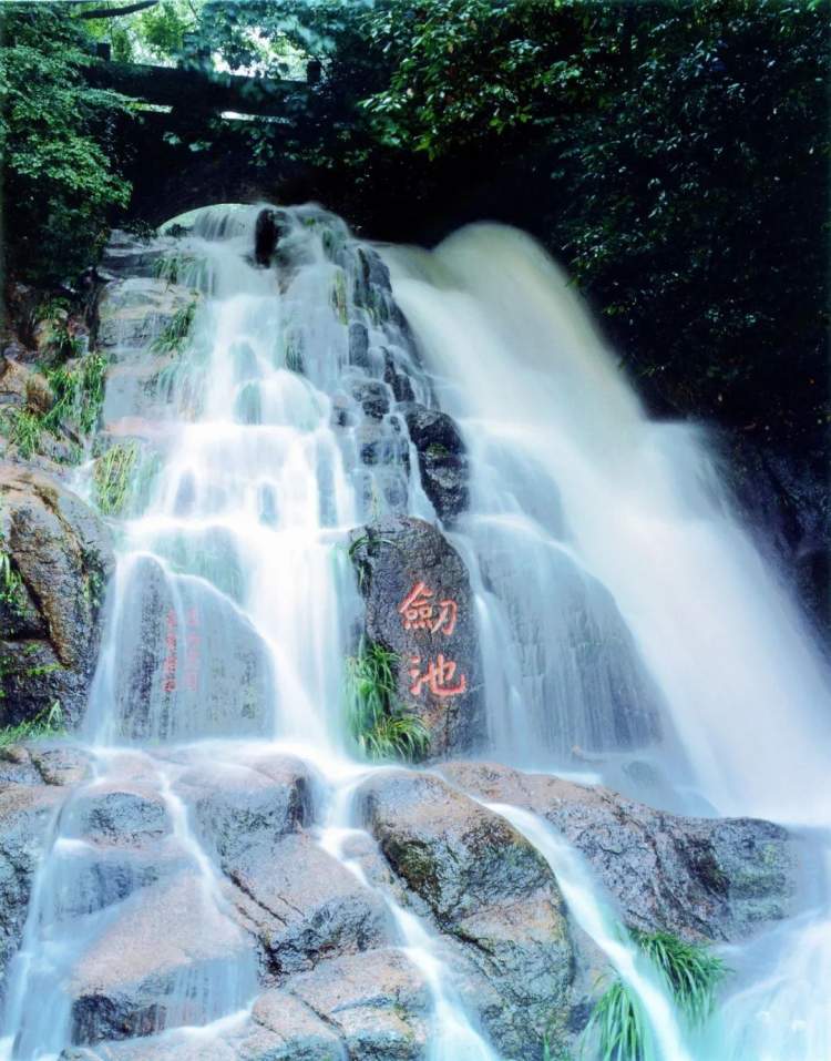 被称为“山中第一名胜”,剑池名气颇大。相传春秋末年,吴王阖闾派干将、莫邪铸剑。夫妻便是在此二人磨以山之石,淬以池之水,铸得两柄无双宝剑。当阳光透过竹林,将斑驳洒在瀑布之上,恍惚间有种置身原始森林的感觉。