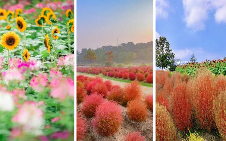 金色花海主要位于植物园三号门附近,主角是向日葵、红苋菜、地肤,尤其是红苋菜,是辰山植物园第一次大面积种植,堪比人高的株型让游客有在小森林中穿行的游园体验。向日葵的品种多大十多种,颜色除了常见的金色,还有红色、黑色等。