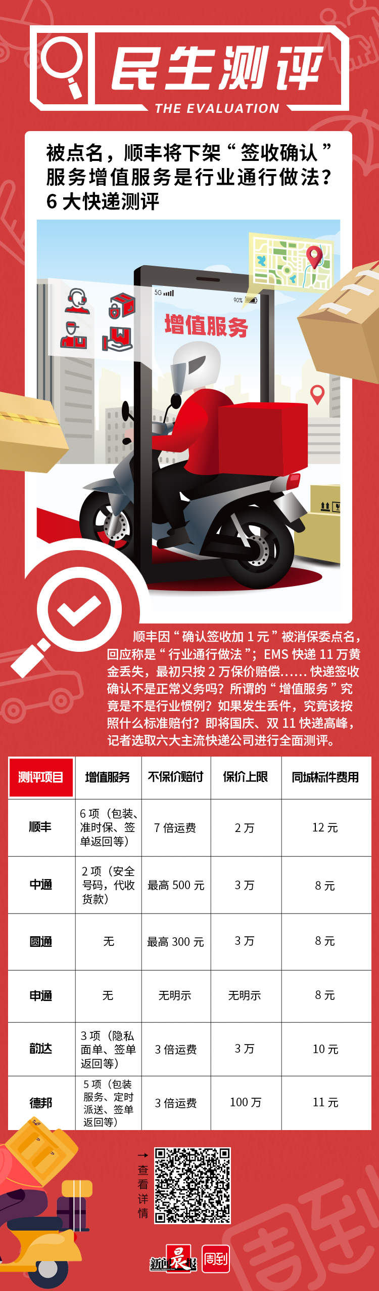 顺丰因“确认签收加1元”被消保委点名,回应称是“行业通行做法”;EMS快递11万黄金丢失,最初只按2万保价赔偿…… 快递签收确认不是正常义务吗?所谓的“增值服务”究竟是不是行业惯例?如果发生丢件,究竟该按照什么标准赔付?即将迎来国庆、双11快递高峰,记者选取六大主流快递公司进行了全面测评。