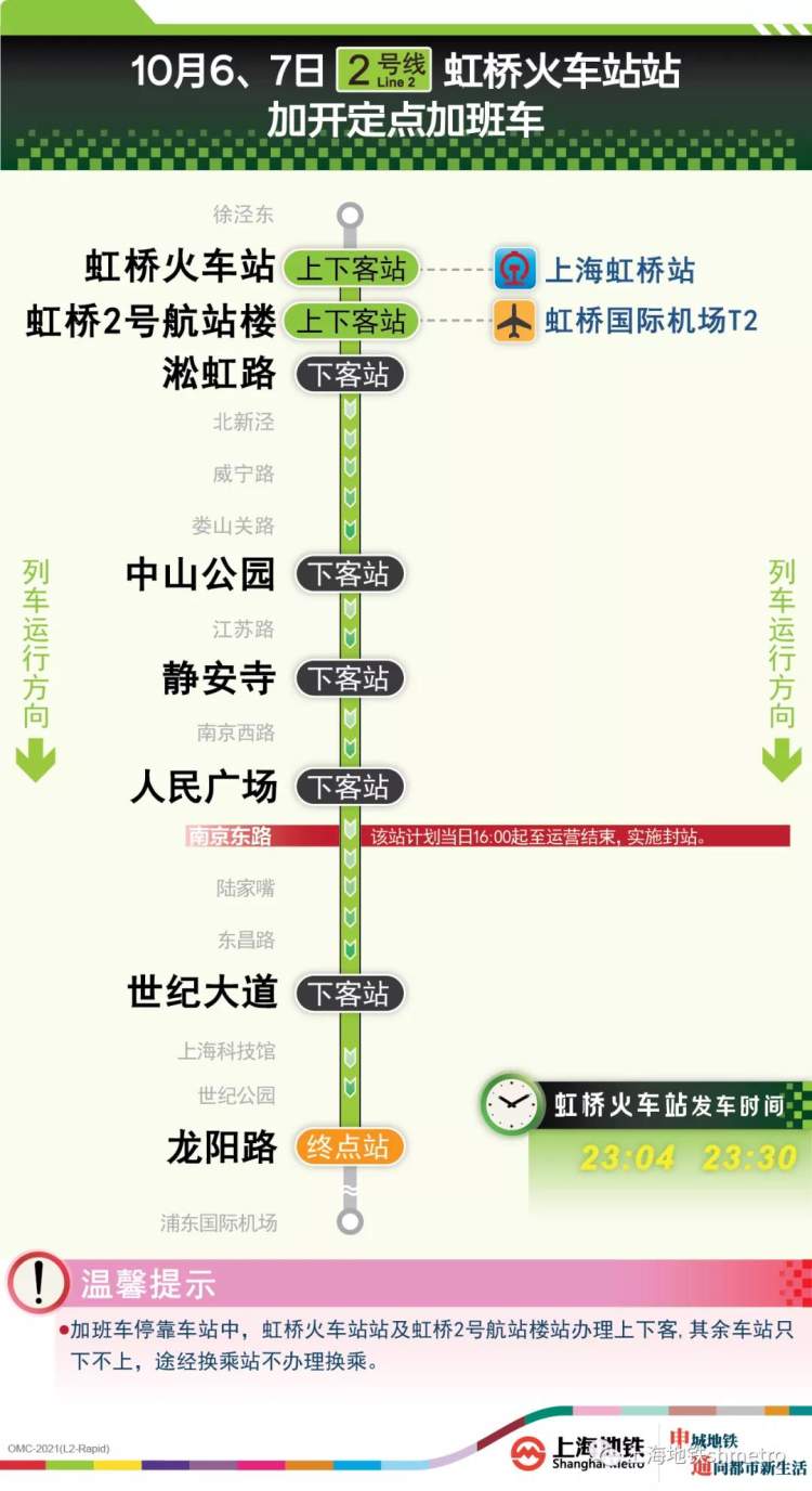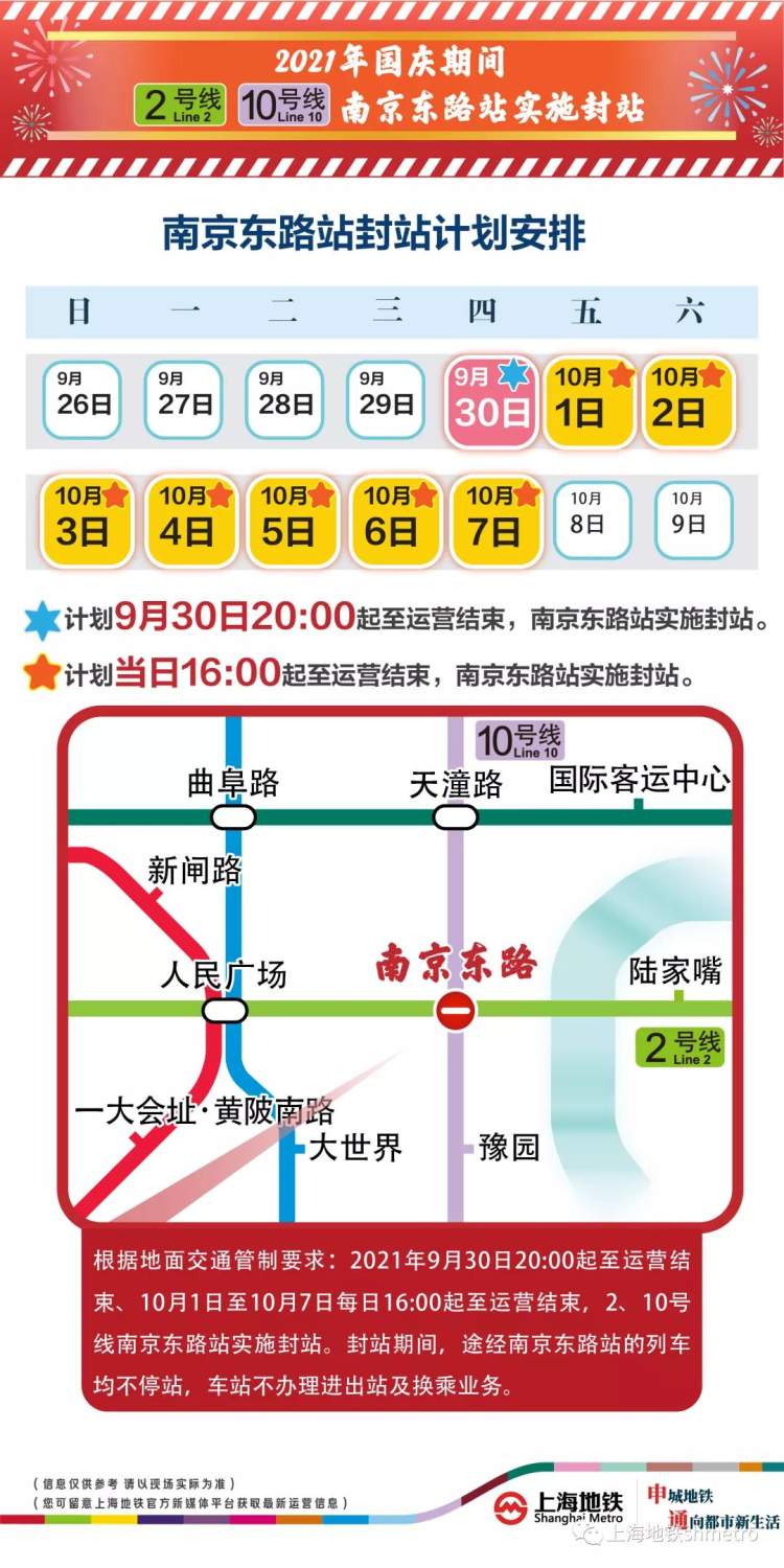 根据交通管制工作方案, 9月30日20:00至运营结束、10月1日至10月7日每日16:00至运营结束,地铁2、10号线南京东路站计划实施封站跳停。封站时段内在南京东路站不能上下车。届时,车站将加强站内广播宣传、导向设置、站台站厅秩序维护等工作。