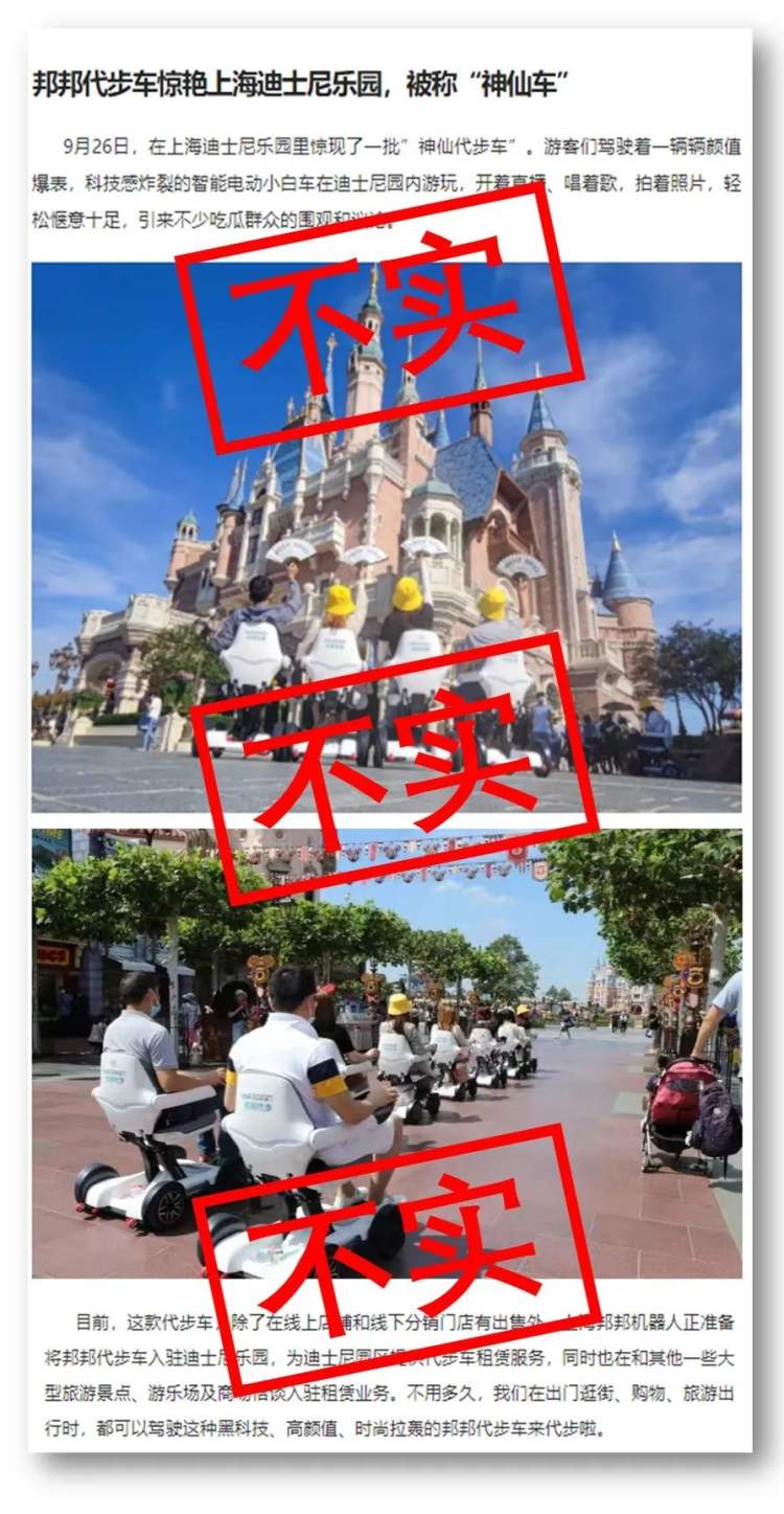 日前,一则“邦邦代步车惊艳上海迪士尼乐园”的消息出现在网络。上海迪士尼度假区今天表示,从未听闻过“邦邦机器人”,且无论是目前还是计划内,都与该公司没有任何形式的合作。在上海迪士尼度假区内,不提供由“邦邦机器人”生产的代步车服务,且不会以任何形式认可其产品。