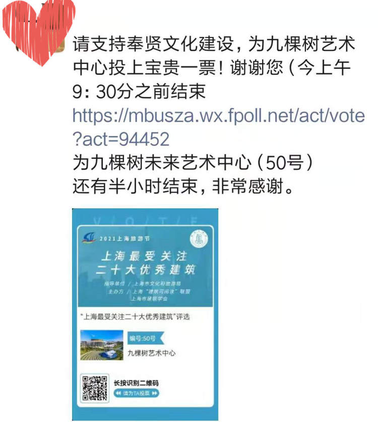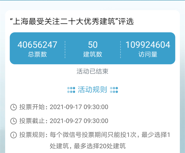 今天上午9点30分,“上海最受关注二十大优秀建筑”社会公众投票结果出炉(点击见详情)。此次投票从9月17日开始,总票数为4065万,访问量为1.09亿人次。按照投票规则:每个微信号投票期间只能投1次,最少选择1处建筑,最多选择20处建筑。记者注意到,在今天上午9点30分之前,仍然有不少市民朋友在为自己心仪的建筑进行拉票(见下图)。