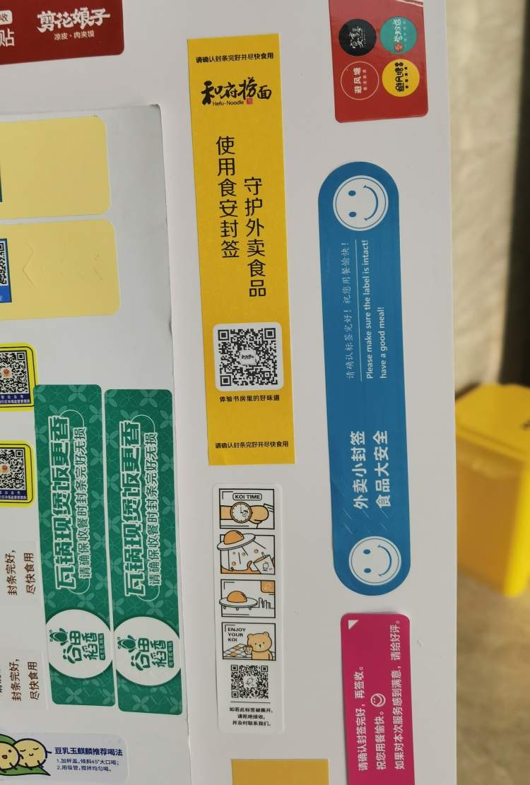 其他如小南国、食其家、麦当劳、肯德基、蔡先生、谷田稻香、潮记等许多商家均设计了丰富多彩的“食安封签”,上面或印有提示消费者监督好食安封签的语句,或印上自家的宣传语、公众号二维码,抑或介绍某种特色餐品及食用方法,甚至还有画上小漫画的……