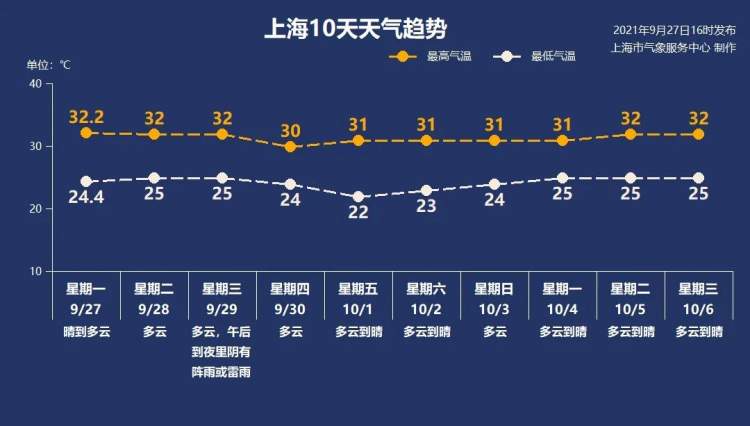 今天多云,最高温度32度 ,10月6日前都是30度以上 周到君 2021-9-28 来源:周到上海 今天上海多云,气温25~32度,南到东南风3-4级。紫外线依然较强,出行适当防护。29日副热带高压有所减弱,午后到夜里会有阵雨或雷雨出没,请及时关注最新的预报预警信息。 9月30日到10月6日,副热带高压再度加强北抬,每天重复晴热晒的天气,最高气温仍在30度以上。我们可能会经历一个近年来最为炎热的十一假期。 来源:周到上海 作者:周到君 赞一个 (0)