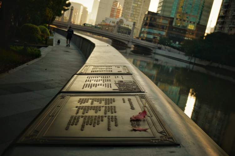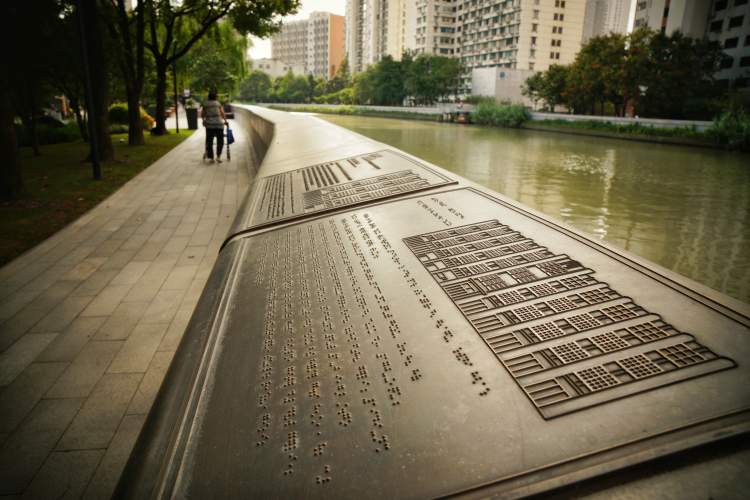 来到静安段,他感兴趣的是河边的盲文——去年,静安区举办“诗话苏河·阅读静安”主题诗歌征集活动,获奖作品以普通文字和盲文镌刻于苏州河静安段滨河空间,供所有游人品读。吴育青早就写了诗作《触摸情感的纹理》,这次是专程来拍这些带有盲文的照片,再亲手触摸一下盲文。