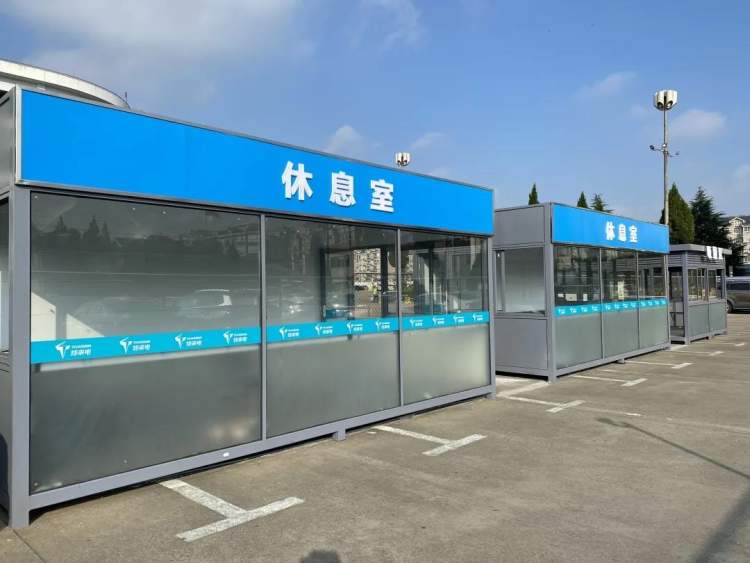 在现场,添置了充电客户的三个休息亭,内含生活设施及充电区域周边的围栏装置;配套有充电区域的进出口闸机、二次识别及计费系统、车位识别、监控及显示屏等信息化项目;此外,区域内车位、车道划线、标识标牌设立、隔离墩安装与厕所等辅助设施也一应俱全。
