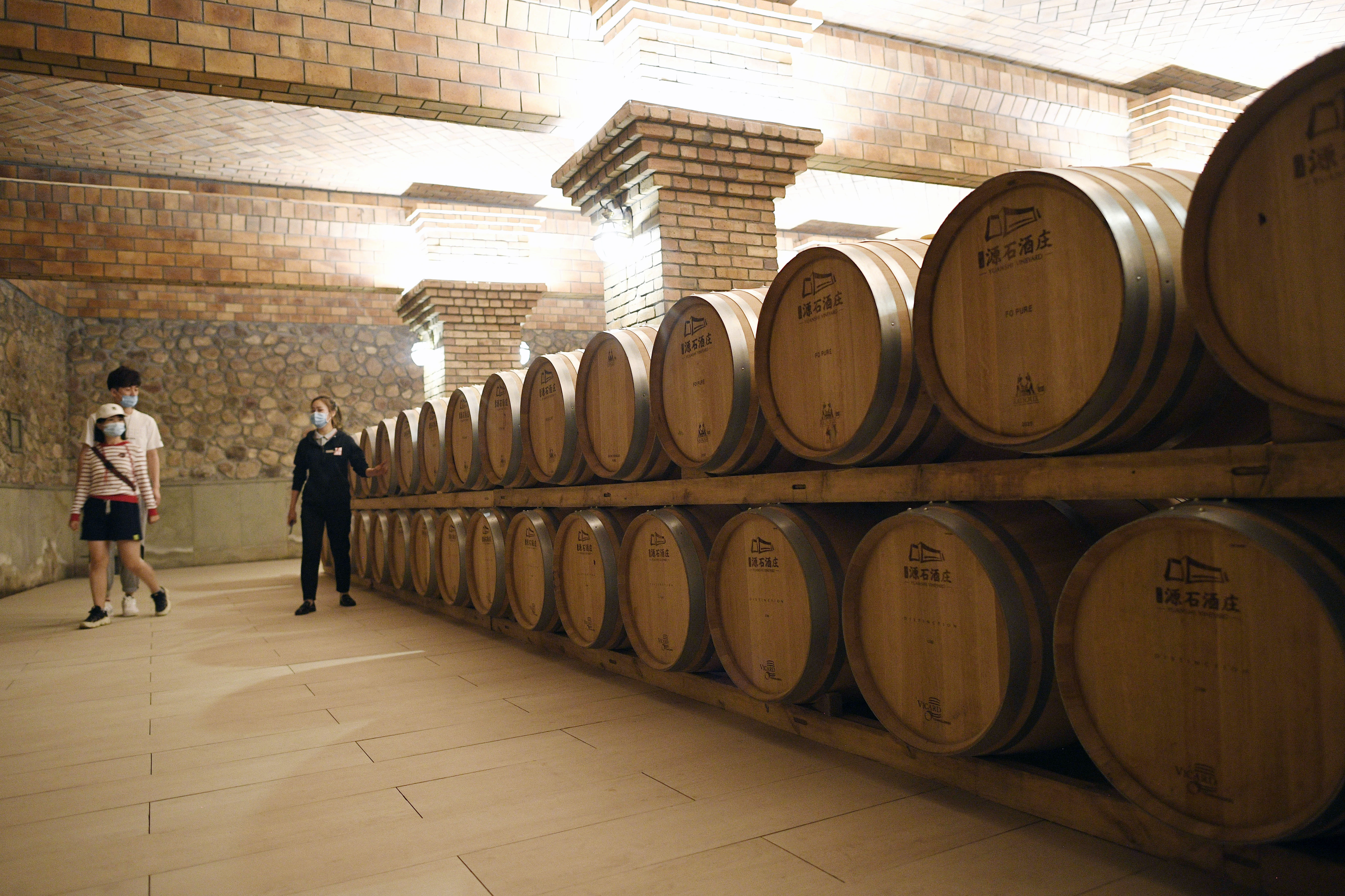 点击后:在位于宁夏贺兰山东麓的一酒庄的橡木桶陈酿区,酒庄工作人员(右)和宁夏大学食品与葡萄酒学院葡萄系的学生一同品尝葡萄酒(7月8日摄)。