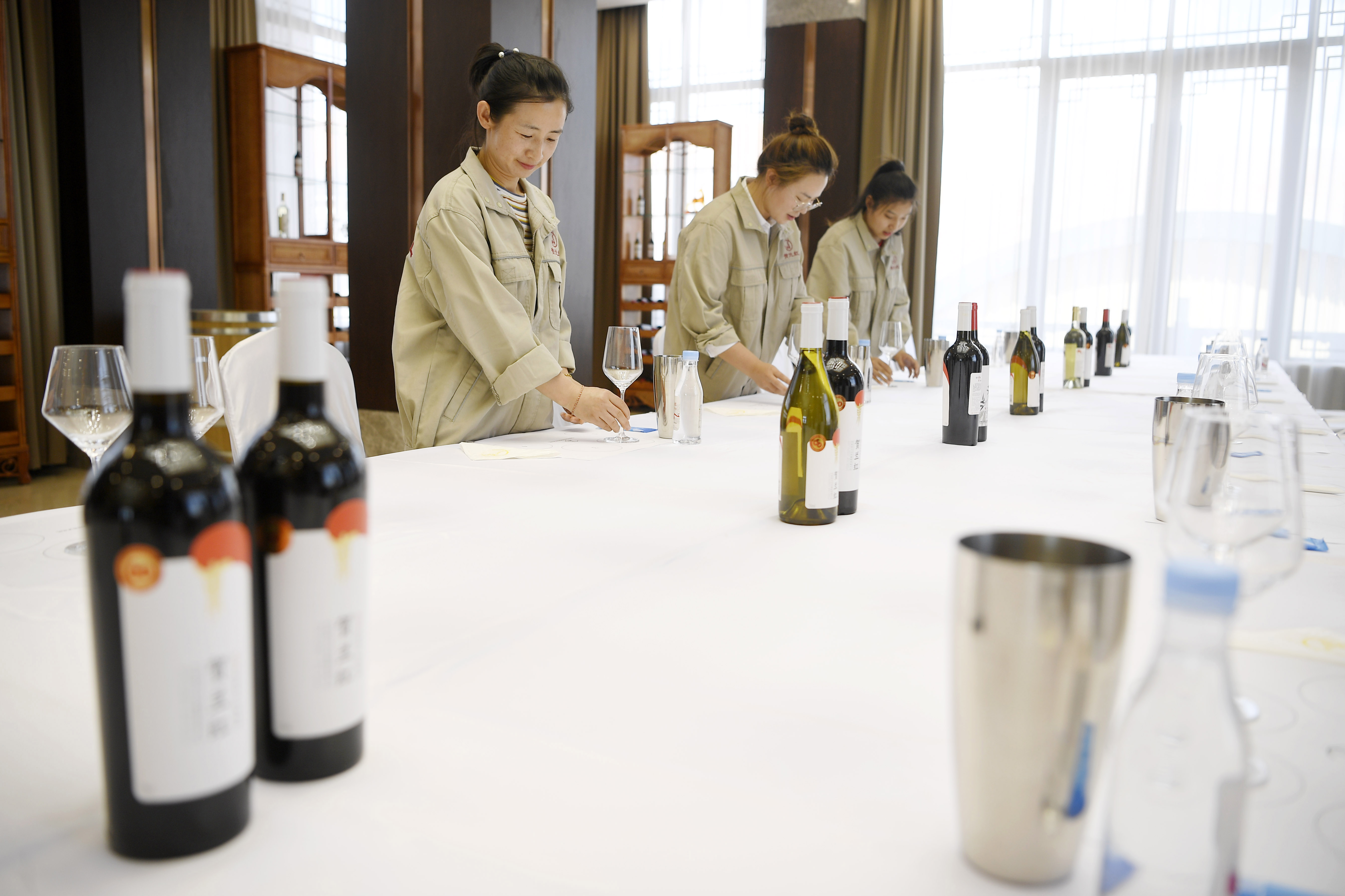 ↑工作人员在位于宁夏贺兰山东麓闽宁镇的贺兰红酒庄为游客摆放品酒器具(7月1日摄)。