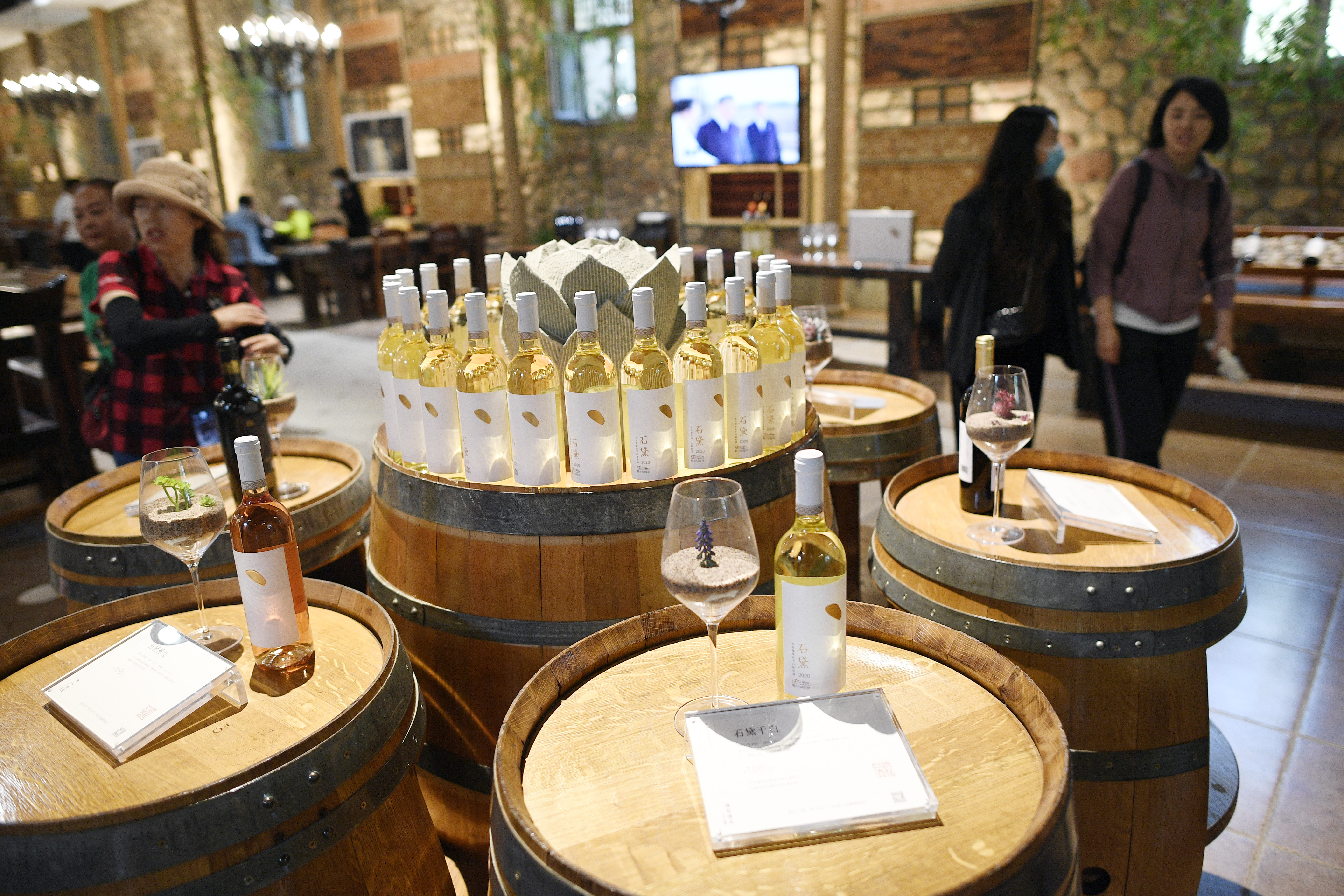 ↑游客在位于宁夏贺兰山东麓的志辉源石酒庄参观游览(9月20日摄)。
