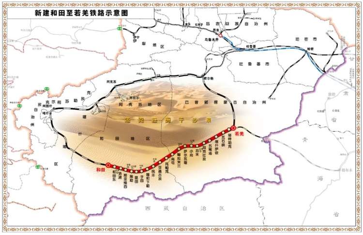 和若铁路的全面铺通,标志着环绕塔里木盆地、包围塔克拉玛干沙漠铁路线的最后一环铺通。和若铁路与南疆铁路、格库铁路共同构成的环塔里木盆地铁路环线,是新疆继去年北疆铁路环线形成之后的又一铁路环线,开通运营后将结束洛浦、策勒、于田、民丰、且末5县不通火车的历史,对于促进地区经济发展、深入推进乡村振兴具有重要意义。